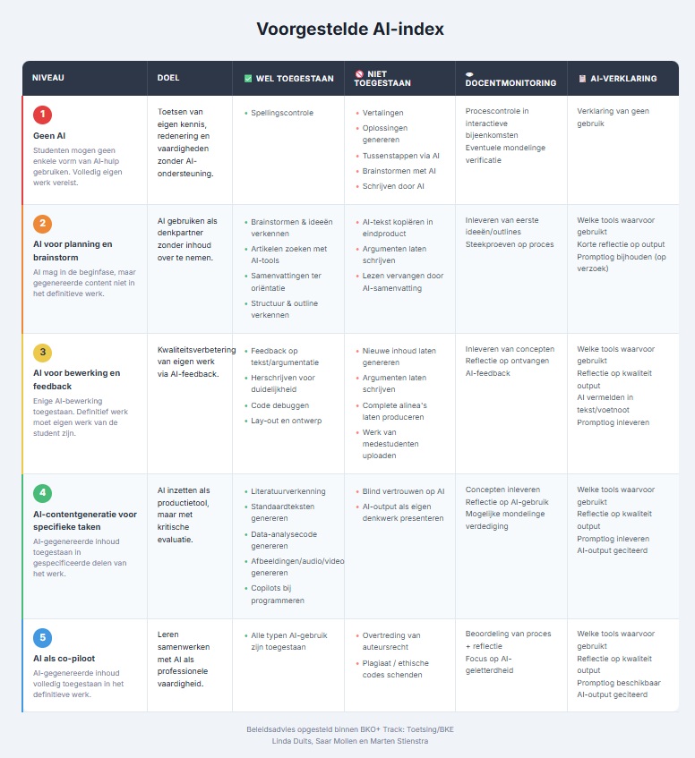 De voorgestelde index kan daarbij een handig hulpmiddel zijn, waarbij studenten gedurende hun bacheloropleiding van een laag AI-index-niveau steeds hoger gaan. Dit betekent fundamentele herziening van bestaande eindtermen: welke competenties blijven cruciaal en welke moeten worden geherformuleerd?
