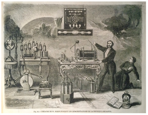Met de verstedelijking waren theaters gekomen, die onderdak boden aan spektakel maar ook aan circulatie van kennis. Vanaf zo 1830 traden daar rondtrekkende goochelaars/wetenschappers op. Ze toonden bijvoorbeeld nieuwe instrumenten als microscopen, toverlantaarns en vergrootglazen: