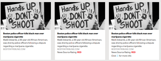 Onderzoeksbureau Gallup/Knight Foundation deed een vragenlijstexperiment met 2010 Amerikaanse volwassenen om de effectiviteit van zo’n systeem te testen. De respondenten kregen verschillende koppen voorgelegd met verschillende condities: alleen de naam van een bron, een oordeel goedgekeurd of onbetrouwbaar en datzelfde oordeel met een linkje naar meer info – zie de afbeelding.