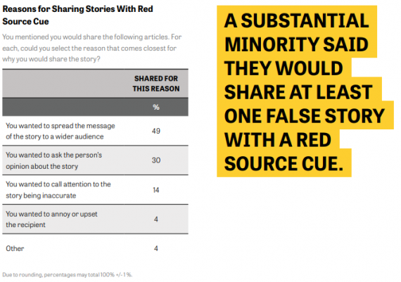 Maar er was ook slecht nieuws. Ook als ze weten dat een bron onbetrouwbaar is, wil nog steeds 34 procent van de respondenten dit verhaal delen. Er is daarbij ook gevraagd naar de redenen om dat dan toch te doen. Zoals onderstaande figuur laat zien, zegt bijna de helft van deze groep dat ze het bericht willen delen omdat ze de boodschap van het bericht wilden delen. Dit komt overeen met onderzoek van Peter Burger naar broodje-aapverhalen: die delen mensen omdat het misschien wel waar had kunnen zijn en een gewaarschuwd mens telt voor twee.