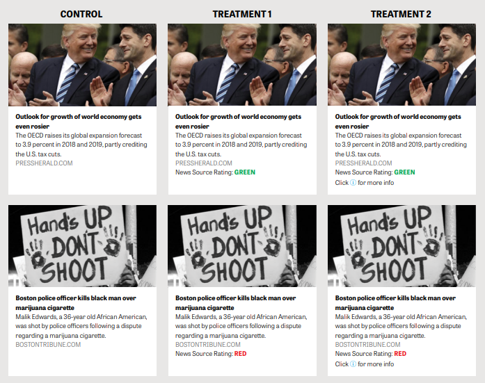 Onderzoeksbureau Gallup/Knight Foundation deed een vragenlijstexperiment met 2010 Amerikaanse volwassenen om de effectiviteit van zo’n systeem te testen. De respondenten kregen verschillende koppen voorgelegd met verschillende condities: alleen de naam van een bron, een oordeel goedgekeurd of onbetrouwbaar en datzelfde oordeel met een linkje naar meer info – zie de afbeelding.