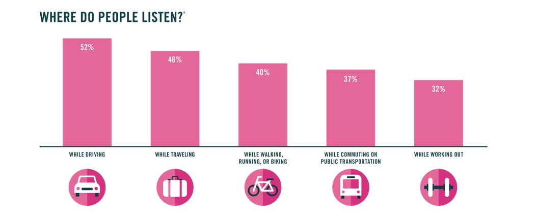 Audio is intiem. Een podcast luister je meestal via een koptelefoon, direct in je oren dus. De informatie die we zo verkrijgen blijft bovendien goed hangen en we bedenken er zelf beelden bij. De narratieve structuur van podcasts zou verslavend werken. Bovendien zijn podcasts uitstekend geschikt tijdens specifieke klusjes waar we onze dag mee vullen: onderweg zijn (in auto of OV) en sporten.