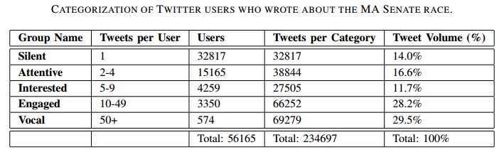 Alle twitteraars werden op basis van het aantal tweets ingedeeld in een categorie, zie onderstaande tabel. Zoals gezegd twittert de zwijgzame meerderheid anders dan de luidruchtige minderheid. Ze retweeten bijvoorbeeld nauwelijks mensen uit de luidruchtige groep (slechts 6 procent), maar juist beroemde mensen en traditionele nieuwsorganisaties. De onderzoekers kwamen erachter dat een deel van de luidruchtige minderheid exact dezelfde tweets verstuurde. Deze waren te herleiden tot een pagina (niet langer online) van Patriot Action Network waar opgeroepen werd tot een twitterbombardement. Er was hier sprake van een aanval, een aanval die bovendien succesvol was omdat kandidaat Scott Brown door deze tweets veel buzz in de media kreeg.