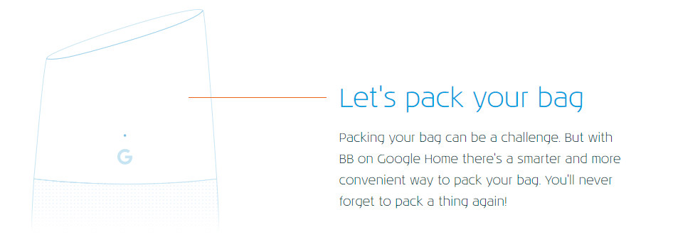 Het levert vooralsnog weinig zinnigs op. De app raadt je aan om je paspoort en tandenborstel in te pakken. Daarnaast koppelt BB de bestemming aan het juiste weerbericht, en kan ze daarom bijvoorbeeld een regenjas aanbevelen. BB is een vorm van kunstmatige intelligentie die voorlopig niet verder komt dan common sense.