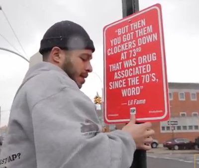 In New York worden huizen waar beroemde mensen hebben gewoond aangegeven met plakkaten op straatborden. Die beroemde mensen zijn meestal al heel lang dood. Kunstenaar Jay Shells wilde een meer hedendaagse variant maken en heeft nu dertig alternatieve borden gemaakt en verspreid over de stad. Op de borden staan teksten uit bekende hiphop-nummers, die verwijzen naar de plaats van het bord. Zo vind je “Cause I want to be on 106 and Park pushing a Benz” (Kanye West) terug op die plek. Shells verwacht dat de borden snel verdwenen zullen zijn, als souvenir meegenomen door een hiphop-fan of verwijderd door de gemeente. Hij ziet dit werk als een cadeautje aan de stad. Meer beeld hier.
