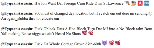 In het netwerk van Gakirah werd zowel proactieve als reactieve agressie geuit naar tegenstanders. Het gaat dan rivaliserende bendes, buurten en wijken en de politie. Proactieve tweets binnen dit thema verwijzen vaak naar een vuurwapen. Er wordt soms verwezen naar een tijd en plek waar de ander geweld aangedaan gaat worden. Reactieve gewelddadige tweets borduren voort op bestaand geweld (screenshot van p. 9, inclusief de toelichting van de onderzoekers):