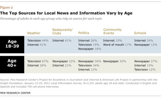 Uit recent onderzoek van het gerenommeerde onderzoeksinstituut Pew Research blijkt dat de lokale krant nog steeds de belangrijkste bron van informatie is voor Amerikanen. In het onderzoek werd gevraagd naar zestien soorten nieuws, zoals verkeers- en weersinformatie, en de bronnen die Amerikanen daarvoor gebruiken. Voor elf van deze soorten is de lokale krant (zowel de papieren versie als online) de voornaamste bron. Lokale televisie trekt in de VS weliswaar een groot publiek, maar het gaat daarbij ‘slechts’ om nieuws als het weer en brekend nieuws. Voor informatie over bijvoorbeeld huizen, scholen en restaurants wordt graag het internet gebruikt. Leeftijd is wel een bepalende factor: de jongere generatie richt zich meer op online (zie figuur beneden). Opmerkelijk is dat social media zoals Facebook nauwelijks van belang zijn en ‘ouderwetse’ mond-op-mond-reclame het nog steeds het beste doet. Het hele rapport staat hier [PDF], een handige interactieve infografiek hier.