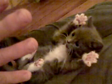 Katjes zijn vaak erg schattig en kunnen soms rare trekken vertonen. Als deze trekken dan opgenomen worden en de filmpjes op Youtube worden geplaatst bestaat een grote kans dat de video viral gaat. Hierbij spelen vooral de opgewekte positieve emoties een rol, die de harten van vele kijkers verwarmen en het klikken op de share-knop vergemakkelijken. Een meer creatieve manier om op de video’s te reageren is het maken van eigen responsefilmpjes, die veelaal hilarische parodieën zijn op het origineel. Het momenteel virale kattenfilmpje ‘Cat hugs kitten’ is hier een goed voorbeeld van. Pas een paar dagen oud en er zijn tal van parodieën, zoals deze. Met rond 12 miljoen kijkers is dit filmpje nog ver verwijderd van het meest succesvolle kattenfilmpje ooit, dat rond 50 miljoen kijkers trok. Wat opvalt bij al de responsefilmpjes is dat mensen de katten nadoen en het gedrag van de katten kopiëren, zoals het filmpje beneden laat zien.