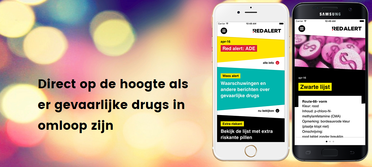 In Nederland worden gebruikers op verschillende manieren gewaarschuwd als er vervuilde drugs in omloop zijn. Er gaan niet alleen berichten uit naar de media, maar er hangen dan ook posters op festivals en in clubs. Het Trimbos-instituut, dat de drugsmarkt monitort en onderzoekt, heeft nu nog een medium gevonden: de gratis app Red Alert voor de smartphone. Zodra er een waarschuwing uit moet, ontvang je een push-melding. Het Trimbos-instituut is een wetenschappelijk instituut dat betrouwbare informatie over drugs biedt. Op dit moment zijn er geen ‘red alerts’. Toch is de app ook dan handig, omdat je er allerlei informatie vindt over drugs laten testen, over risico’s en wat te doen bij problemen: onderkoeling, te hard gaan of een kaakklem.