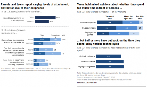 Ongeveer de helft van de tieners vindt dat van zichzelf dat ze teveel op hun telefoon zitten. Negen van de tien vindt in het algemeen dat teveel tijd online een probleem is voor mensen van hun leeftijd. Iets meer dan de helft onderneemt actie om hun telefoongebruik te beperken. Ook hun gebruik van sociale media (57%) en games (58%) leggen ze aan banden, dit terwijl de percentages van tieners die vinden dat ze teveel tijd doorbrengen met sociale media en games lager liggen, respectievelijk 41 en 26 procent. Opmerkelijk: slechts 45 procent geeft aan dat ze bijna constant online zijn.