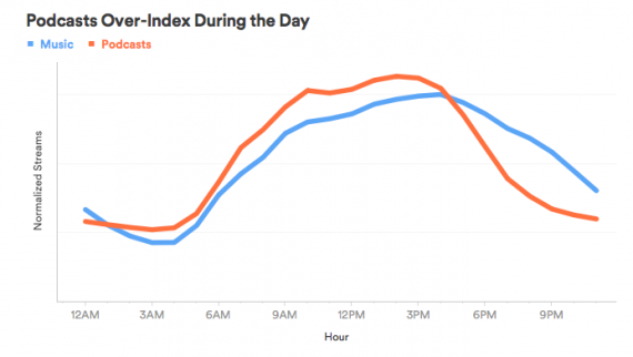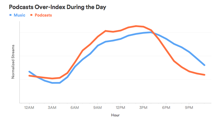 Spotify biedt naast muziek ook podcasts aan en verzamelt dus ook data over wanneer daarnaar geluisterd wordt. Communis opinio is dat podcast luisteren hoort bij forenzen en klusjes zoals hardlopen of afwassen – taken waarbij je niet erg met je hoofd bezig bent. Data van Spotify spreken dat tegen. Het podcast-luisteren via de streamingdienst volgt grotendeels hetzelfde patroon als muziek luisteren. Er wordt veel meer geluisterd op werkdagen dan weekenddagen en luistercijfers pieken in de middag. Daarom legt Spotify een verband tussen werk en podcasts luisteren.