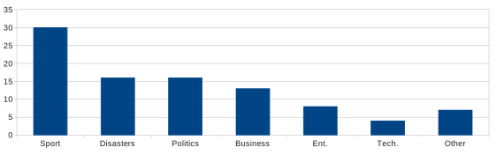 Het is niet mogelijk om vast te stellen wie het snelste nieuws brengt. Soms is dat Twitter, soms zijn dat de persbureaus. De tabel beneden laat zien voor een aantal gebeurtenissen wie het snelst was, met in de derde column het tijdsverschil. Twitter is het snelst voor specifieke gebeurtenissen, met name sport (een derde), gevolgd door rampen en politiek – zie de figuur beneden.