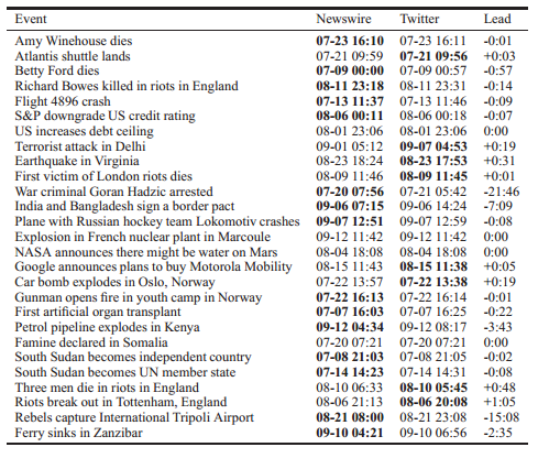 Twitter wordt vaak geroemd om snelheid: omdat Twitter realtime is, zou dit de snelste manier zijn om nieuws door te geven. In een studie [volledige toegang] gepresenteerd op het International AAAI Conference On Weblogs And Social Media afgelopen juli analyseren informatici in hoeverre dat juist is. Ze onderzochten twee datasets over de periode juni-september 2011: een kleine set handmatig gekozen gebeurtenissen die hebben geleid tot grote nieuwsverhalen en een grotere set mogelijke gebeurtenissen automatisch opgepikt. Ze vergeleken steeds Twitter met de persbureaus [newswires] BBC, CNN, Google News, New York Times, Guardian, Reuters, The Register en Wired.