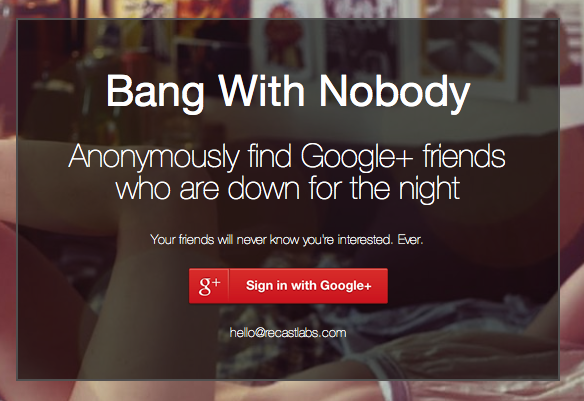 Het internet zou het internet niet zien als mensen niet direct gingen voortbouwen op het idee. Zo werd er Bang With Professionals gemaakt [inmiddels uit de lucht] waarbij het idee werd toegepast op LinkedIn. Grappiger is echter Bang With Nobody. Deze app richt zich op Google+, de spookstad van het sociale internet. De tagline: “Anonymously find Google+ friends who are down for the night. Your friends will never know you’re interested. Ever.” Bang With Nobody is zo een veilig alternatief, waarover niemand zich zorgen hoeft te maken. Wanneer je inlogt met je Google+-account, krijg je te zien waar het de makers allemaal om te doen was.