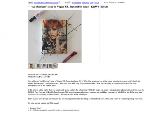 Tot slot plaatste Davies zijn advertentieloze Vogue op Craigslist. Dat was vorige week donderdag. Hij wacht – uiteraard – nog steeds op een koper.